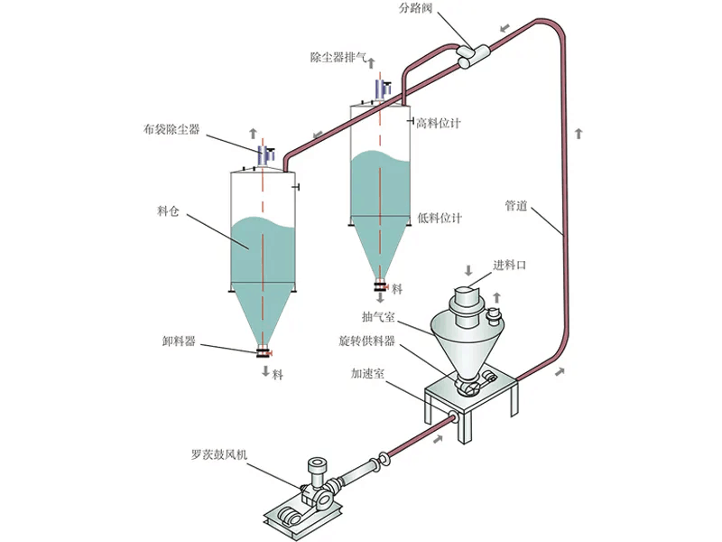 氣力輸送系統的工作原理是,利用羅茨風機產生的正壓氣流作為輸送動力,帶動物料在氣力輸送管道內運輸,從而確保物料能順利到達后續的儲料倉中.